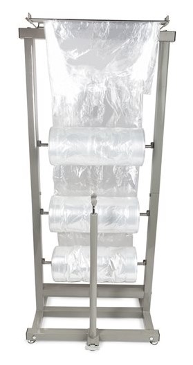 Sturdy freestanding 3-roll bagging station with bagging jack. Poly bags not included.