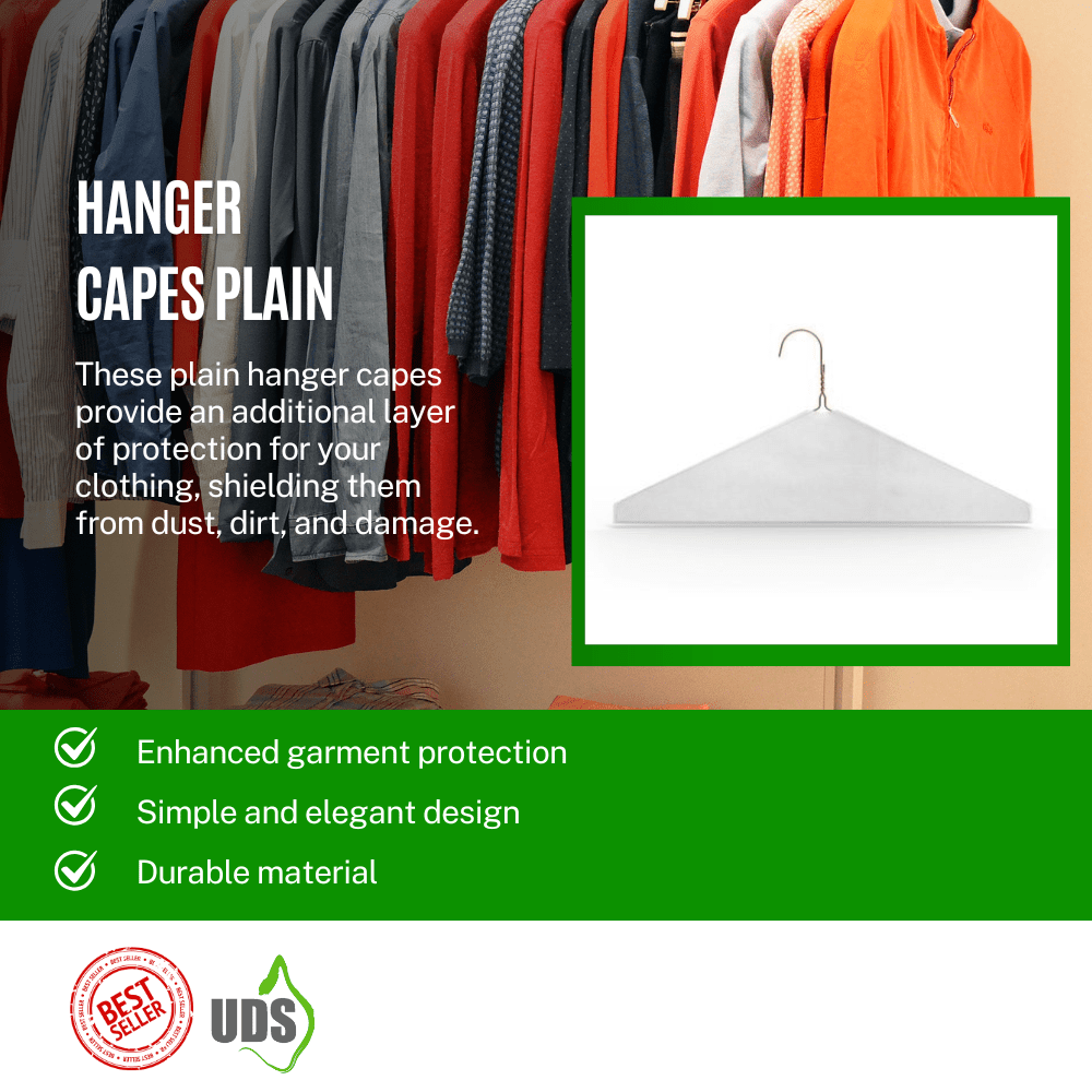 Hanger Capes Plain. These plain hanger capes provide an additional layer of protection for your clothing, shielding them from dust, dirt, and damage. Ideal for both home and professional use, these capes ensure your garments stay clean and presentable.