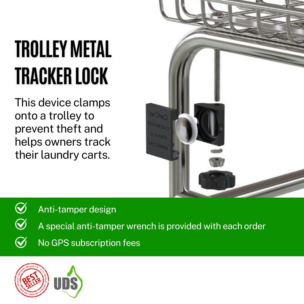 Trolley Metal Tracker Lock: This device clamps onto a trolley to prevent theft and helps owners track their laundry carts.